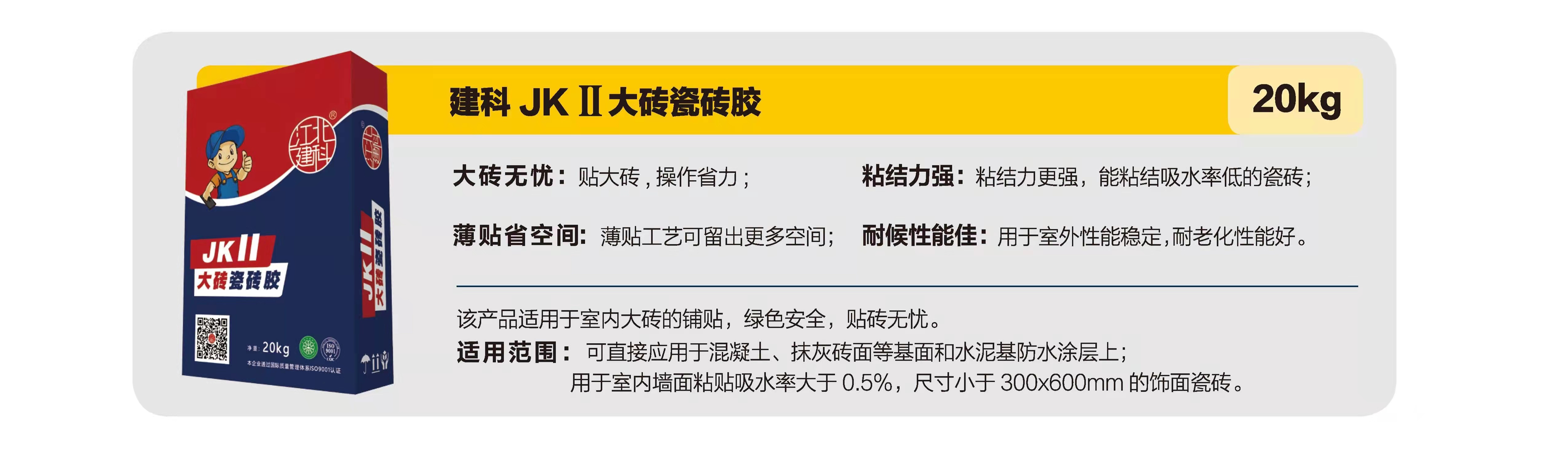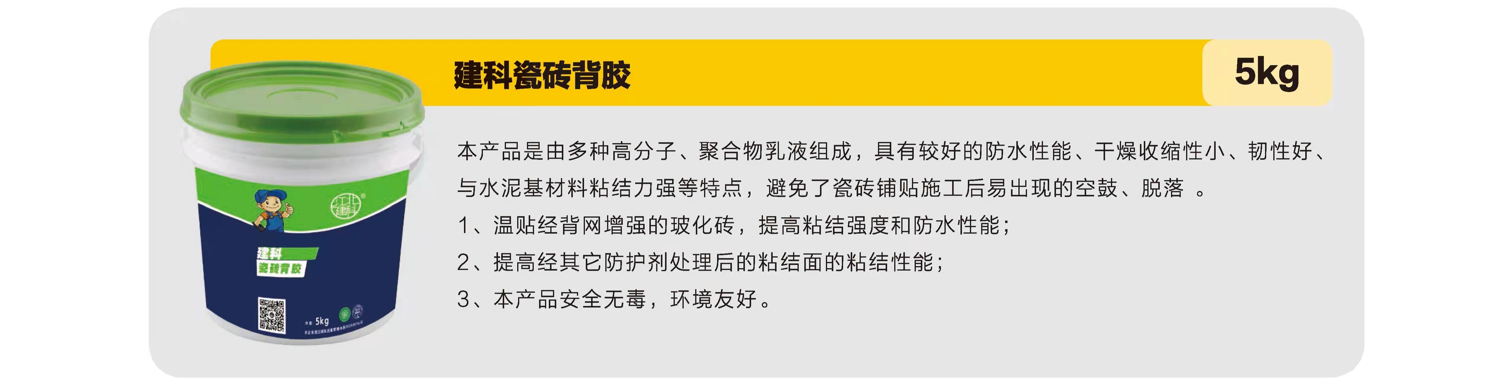 如需鋪貼玻化磚或較大瓷磚時,可配合建科瓷磚背膠使用;施工溫度不低于5℃。