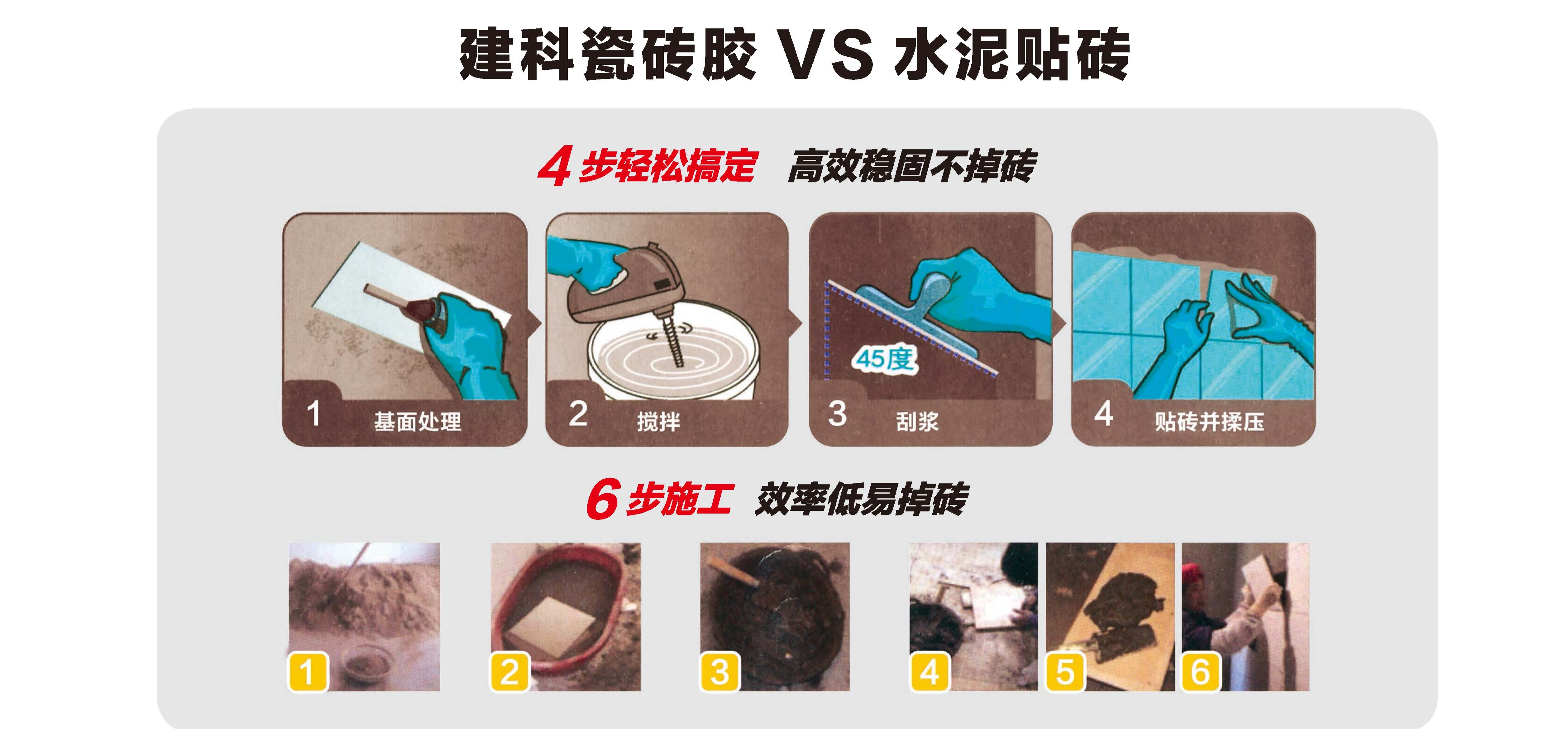 江北建科率先引進國際主流的貼磚材料一瓷磚粘結劑,與傳統水泥工藝相比,瓷磚粘結強度超過水泥貼磚2-3倍, 與建筑同壽命,并且采用國際先進的薄貼技術更可節省空間。此外,瓷磚粘結劑環保無毒害 保水性好、耐候性更好 ,能徹底解決滲水、磚裂、空鼓、脫落等鋪貼問題。