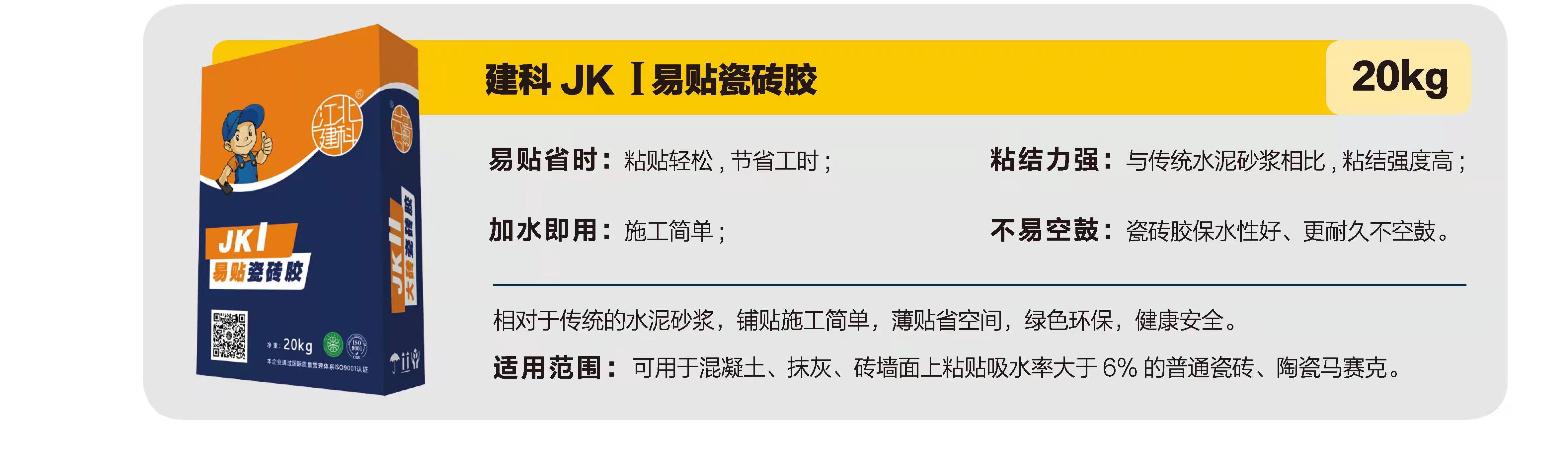江北建科倡導環保至上的原則,特推出代替裝修現場用水泥、沙子來攤鋪貼磚、填縫、砌筑、 批墻、找平的全能砂 漿即全能瓷磚膠,降能降耗,一款多用, 經松搞定。產品用于貼磚填縫二合一,一般為灰色如需其 它顏色(白色、黑色、 紅色、咖啡色等)則需提前定制。